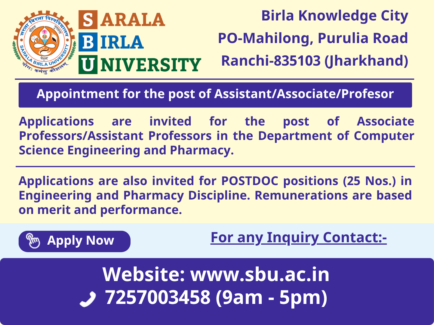 The Sarala Birla University aims to build an egalitarian global society based on national integrity, equality, social justice, secularism, freedom & fraternity, international understanding and scientific approach to the problems of the society, as enshrined in the constitution of India through various modes of teaching-learning process and supported by curricular and co-curricular activities.
